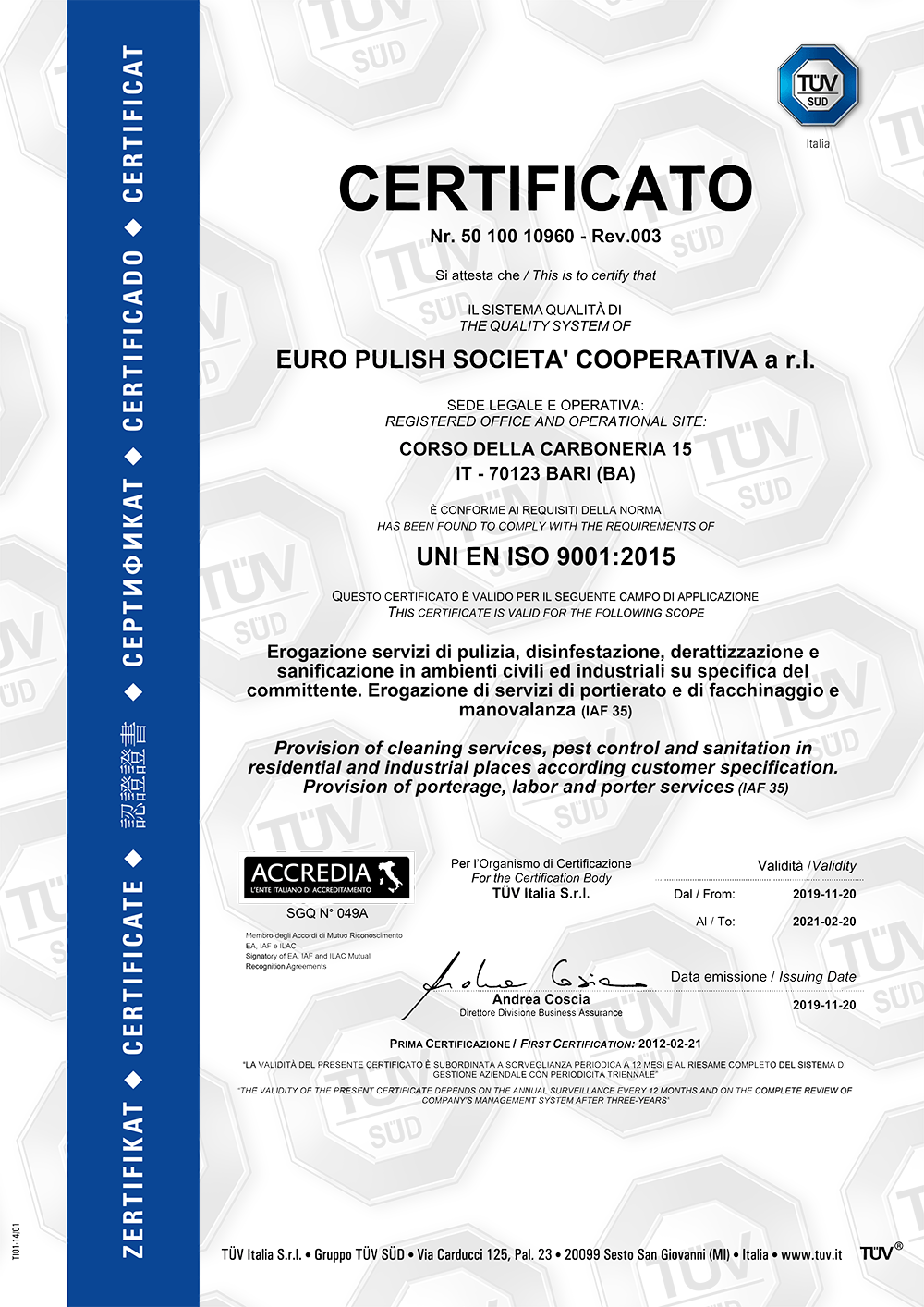 Nel settore delle pulizie professionali la qualità operativa è strettamente collegata alla gestione dei processi e al rispetto delle procedure. Euro Pulish sviluppa i propri servizi attraverso un’organizzazione che pone attenzione alla corretta esecuzione degli interventi e alla gestione delle attività nel tempo. Le certificazioni rappresentano un elemento che testimonia l’attenzione dell’azienda verso la qualità dei servizi e verso l’adozione di procedure strutturate.